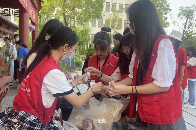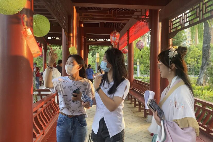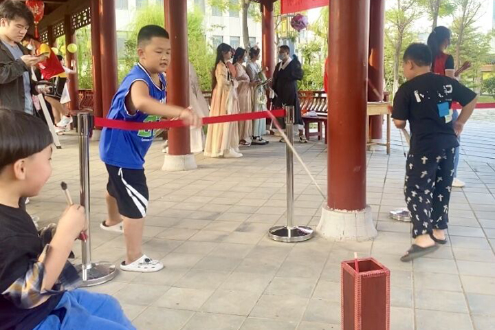 活动以猜谜答题为主要内容,设置党史学习教育题、中医药字谜和教师节相关知识共100道题,在工作人员带领下有序进行赏灯答题,赢取礼品。同时活动还有设置投壶、中药香囊手工制作等区域,吸引众多师生“大显身手”,其乐融融。
