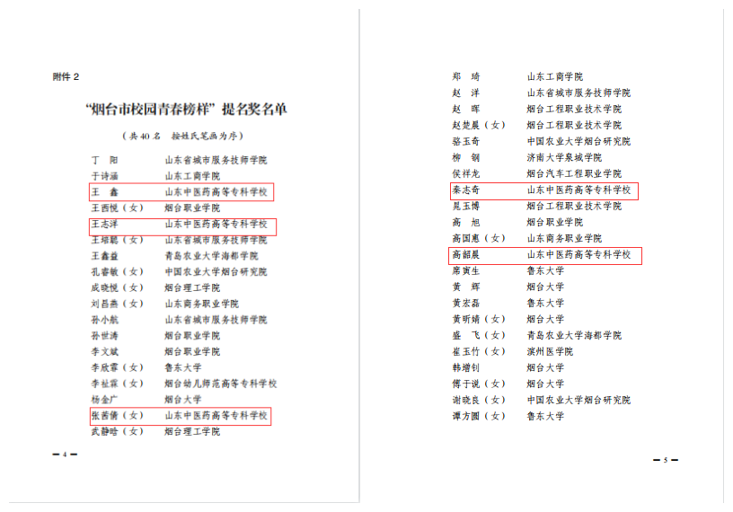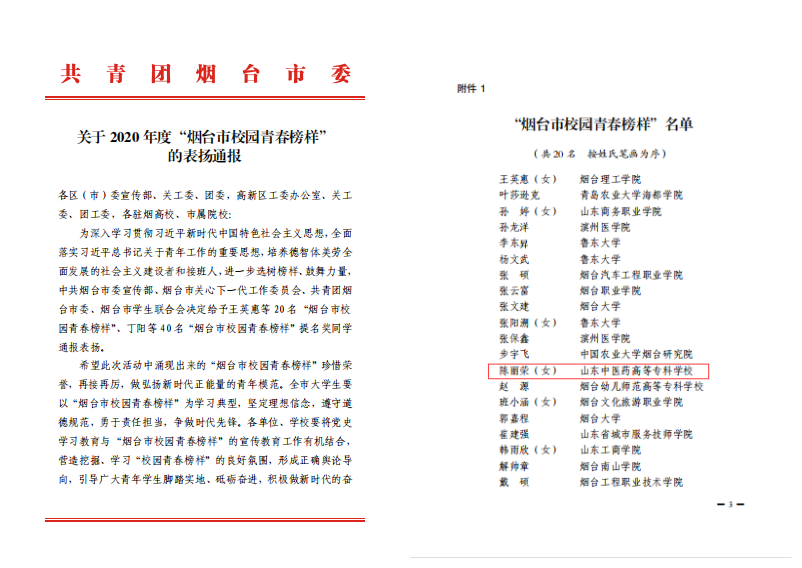 近日,共青团烟台市委下发了《关于2020年度“烟台市校园青春榜样”的表扬通报》,我校陈丽荣同学获评“烟台市校园青春榜样”,王鑫、王志洋、张茜倩、秦志奇、高韶晨5名同学获“烟台市校园青春榜样”提名奖。