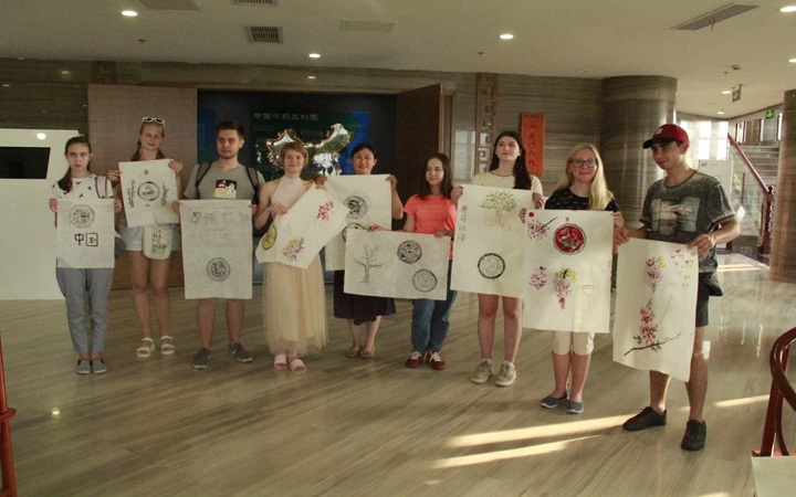 此次活动俄罗斯学生、韩国学生分为两组,展厅参观学习和实践课堂轮流开展。由讲解老师带领国际学生们走进展厅,讲述中医药故事,了解我国传统医药文化。实践课堂上,学生们第一次了解中国传拓技艺,认识宋代元祐通宝和秦汉瓦当,在老师带领下动手制作钱币和瓦当拓片,并纷纷题字绘画,完成一幅幅艺术作品。俄罗斯学生还围着老师学习国画,在拓片作品上认真书写“中国”、“厚德载物”等毛笔字。通过活动也深切感受到俄罗斯学生对中国文化发自内心的喜爱。