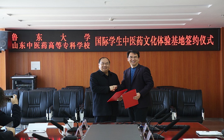 亢世勇在讲话中对我校中医药文化建设成果给予高度评价,认为我校办学特色鲜明、办学优势突出,有利于拓宽国际留学生的文化视野,加深对中国文化更深刻的认识,吸引更多留学生来烟访问交流,表达了以中医药文化体验基地为平台、加深两校间紧密合作、推动优秀传统文化传承与发展的强烈意愿。战文翔代表学校对鲁东大学与学校共建国际学生中医药文化体验基地表示感谢,认为体验基地的建立有利于学校更好地融入国家“一带一路”建设,拓展学校的国际办学空间,增强学校的影响力和美誉度,并期待两校之间继续加强合作,使基地充分发挥作用、越办越好,将传统文化和中医药文化推向更广的国际舞台。