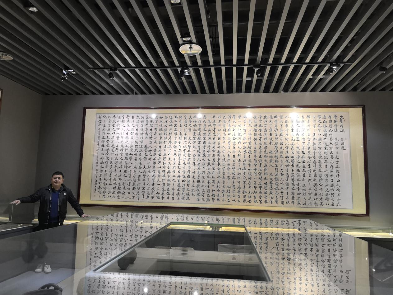 汪庆誉先生,笔名言心,安徽黄山人,师承启功、刘炳森、刘大为、王中年等当代名家,被誉为“启功体书法传承第一人”,现任中国国家书画院副院长、启功书法研究会副会长。十年前,汪庆誉先生为中医药综合实训基地题写六丈巨幅书法作品《大医精诚》,该作品在中医文化专区展示,成为基地的重要文化藏品。此次来访,汪庆誉先生在作品前驻足留念,并分享了当年的创作心得。他表示,《大医精诚》不仅是中医精神的凝练,更是中华优秀传统文化的体现,希望通过书法艺术弘扬医者仁心、济世为民的高尚品格。