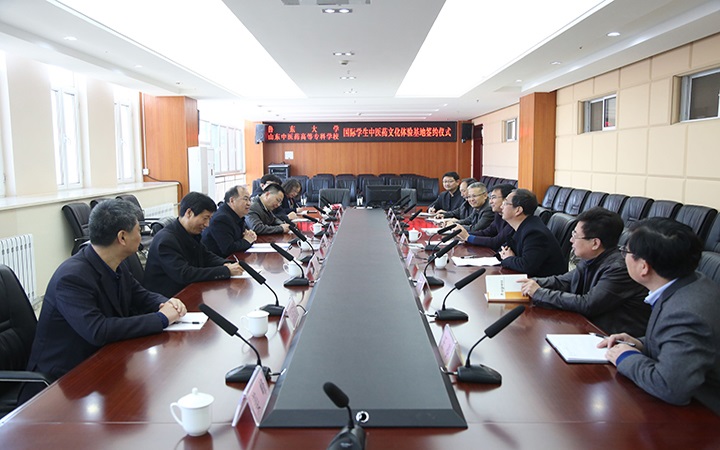 亢世勇在讲话中对我校中医药文化建设成果给予高度评价,认为我校办学特色鲜明、办学优势突出,有利于拓宽国际留学生的文化视野,加深对中国文化更深刻的认识,吸引更多留学生来烟访问交流,表达了以中医药文化体验基地为平台、加深两校间紧密合作、推动优秀传统文化传承与发展的强烈意愿。战文翔代表学校对鲁东大学与学校共建国际学生中医药文化体验基地表示感谢,认为体验基地的建立有利于学校更好地融入国家“一带一路”建设,拓展学校的国际办学空间,增强学校的影响力和美誉度,并期待两校之间继续加强合作,使基地充分发挥作用、越办越好,将传统文化和中医药文化推向更广的国际舞台。