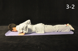 动作2:双手着席不动,躯干继续前行,呈俯卧位,双肘关节屈曲(图3-2)