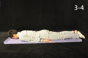 动作3~4,反复操作3~5次,回至俯卧位,双手松置体侧,掌心向上(图3-4)。
