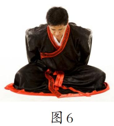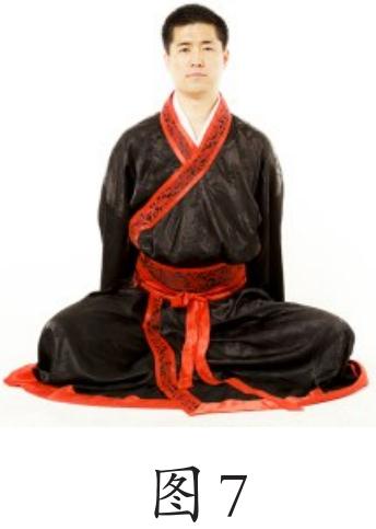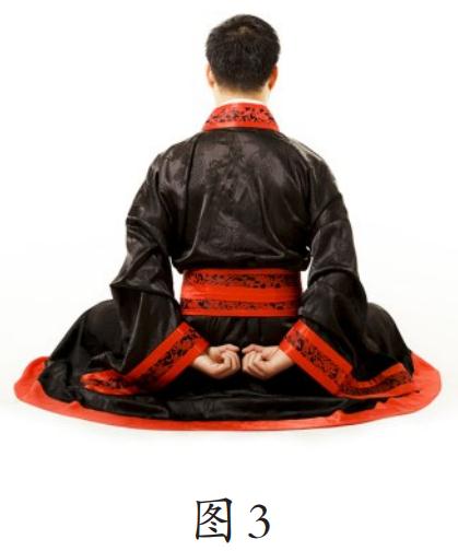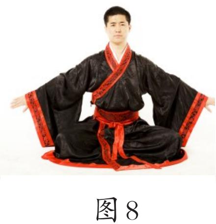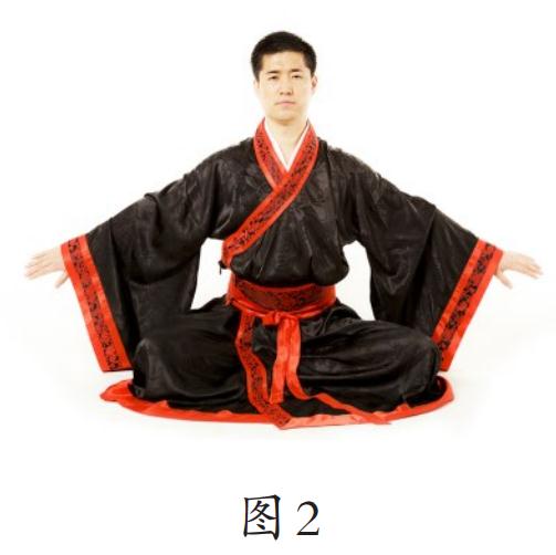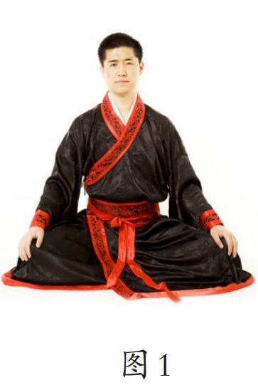 1.采用盘坐式,两手自然覆按于两膝,正身端坐,呼吸均匀,思想安静,全身放松(图1)。