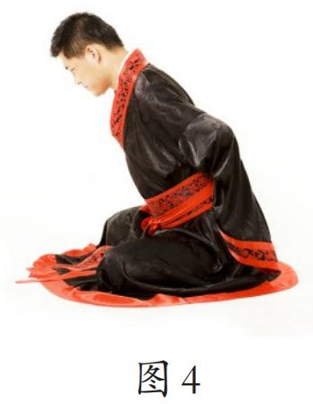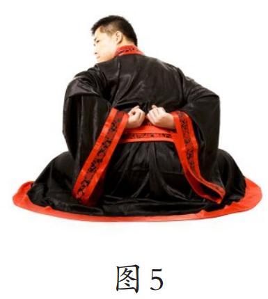 3.接上式,两手从指尖开始捲握成空拳,同时两拳向后划弧,至拳眼轻轻抵在骶骨两旁(图3)