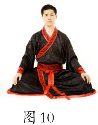 10.接上式,沉肩坠肘,松腕舒指,下落还原,两手覆按两膝,目视前下方,呼吸自然,全身放松(图10)。