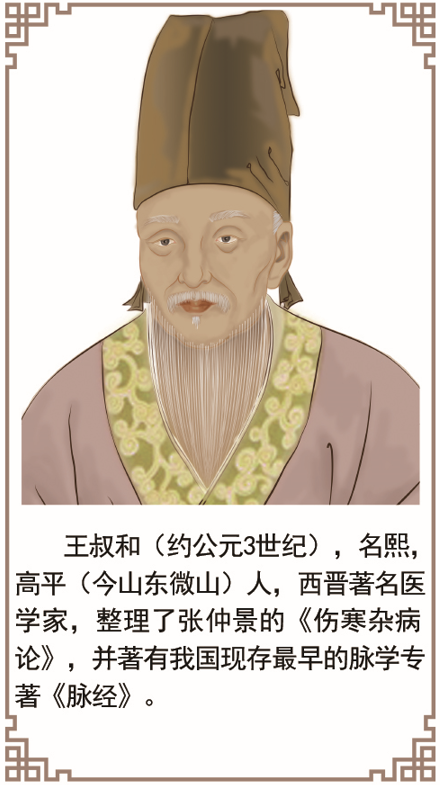 总结秦汉以来医家切脉经验,写成我国第一部完整而系统的脉学专著《脉经》,分10卷98篇。该书将脉的生理、病理变化和疾病的关系归结为浮、芤、洪、滑、数、促、弦、紧、沉、伏、革、实、微、涩、细、软、弱、虚、散、缓、迟、结、代、动等24种脉象,从理论上对其性状逐一论述。后人应用的最常见脉象,都不出这24脉的范围。还创立了"独取寸口(手腕部)"的"三都九候"切脉新法。这套三部脉定位诊断法至今仍被中医临床诊断所采用。由于他把切脉、症状、治疗有机地结合起来,才使脉学成为中医诊断疾病的一门科学。